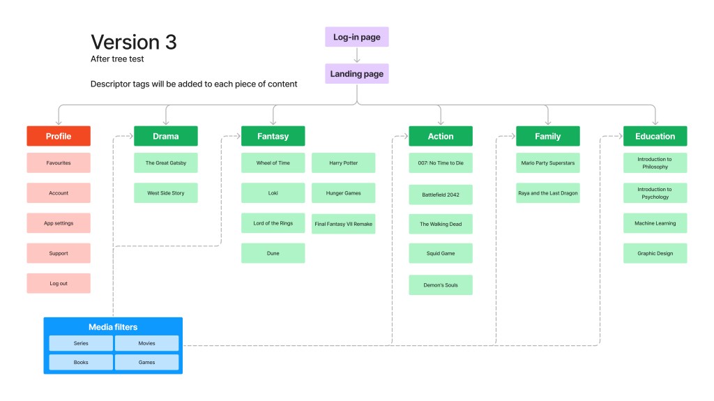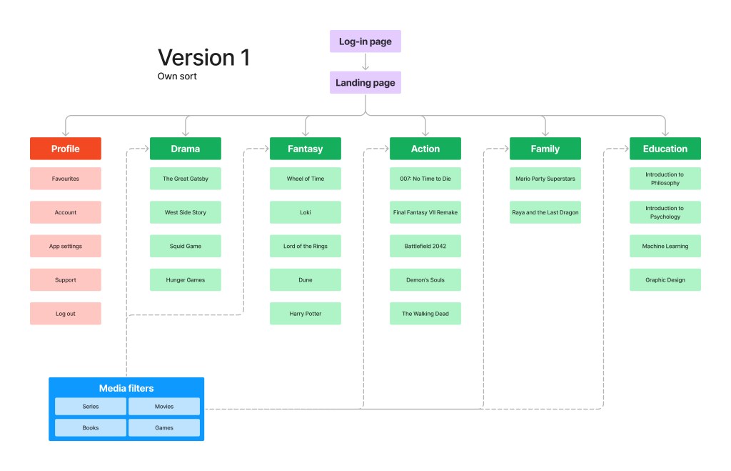 20 pieces of content (movies, series, games, courses) were identified and went through three stages of sorting. Site maps were created to organise the categories. The images can be clicked to expand.