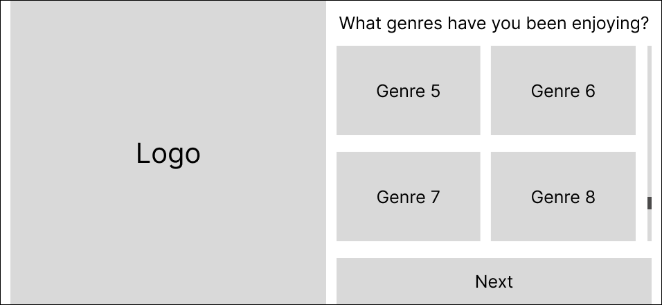 First-click and navigation tests were conducted on various elements of these frames. Participants were generally successful for most tasks except for one: when asked where they would click to reveal more genres in the onboarding page, most participants missed the thin scroll bar and clicked the Next button instead. This was then addressed in the hi-fi prototype.